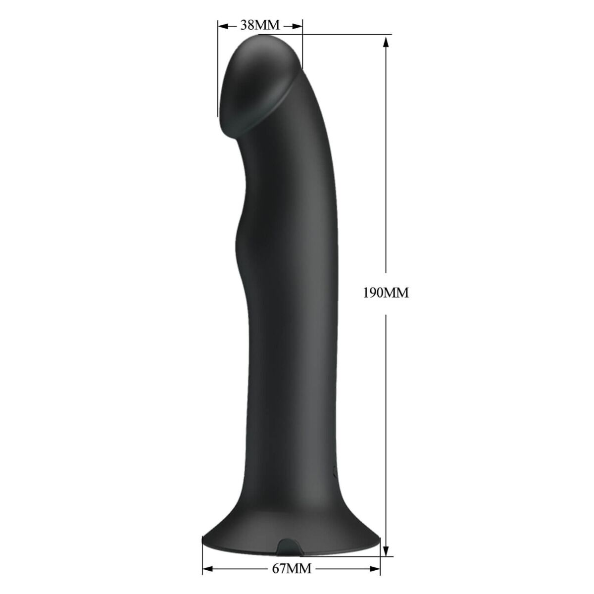Довжина іграшки — близько 19 см, максимальний діаметр — приблизно 3,8 см, тобто це відчутно «напружений» середній розмір: не міні, але й не екстремал. Стовбур виготовлений із м’якого силікону, приємного до тіла, всередині ховається жорсткіша основа з пластику, яка тримає форму. Надміцна присоска на розширеній основі чіпляється до гладких поверхонь — плитка, стіл, стіна у ванній — і одночасно слугує обмежувачем для безпечних вагінальних та анальних ігор.