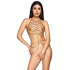 Ця золота прикраса для тіла — не просто аксесуар, а вишуканий виклик усьому стриманому. Еротичний ланцюжок, що м’яко облягає груди та стегна, створює ефект білизни без білизни, огортаючи жіноче тіло блиском, який говорить голосніше за будь-які слова.