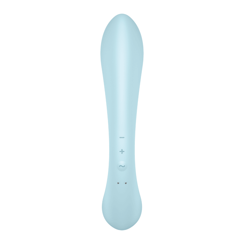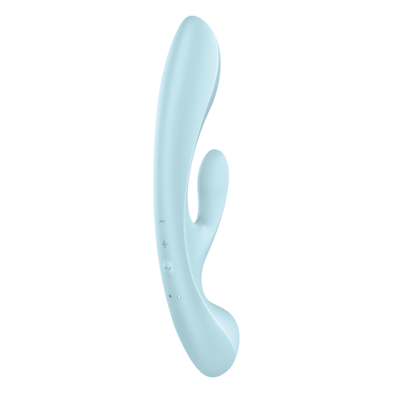 За допомогою кнопок +/- ви зможете вибрати із 12 програм вібрації для кролика, а кнопка ~ дозволить вам вибрати із додаткових 12 програм вібрації для масажної палички. Satisfyer Triple Oh виконаний з безпечного для тіла силікону, що бризкає (IPX7) і перезаряджаємо.
