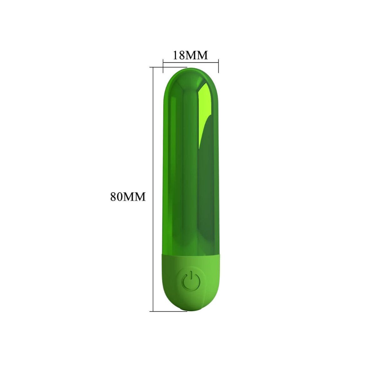 Корпус у неї твердий, із гладкого пластику з металевим глянцевим блиском: зелений колір, блиск, акуратна форма без зайвих виступів. Довжина близько 8 см і діаметр 1,8 см дозволяють легко тримати іграшку двома пальцями та точно потрапляти в потрібні зони — клітор, вуздечка, соски, внутрішня поверхня стегон. Вона не виглядає «страшно», тому підходить і як перша іграшка, і як додатковий інструмент до вже знайомих вібраторів.